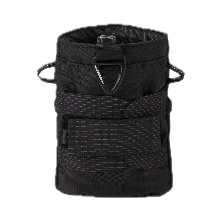 フロントにストレッチ生地のポケットを備え、小物などを収納できます。背面にはベルクロ式のアタッチメントとフックを備え、パックにさまざまな方法で取り付けることが可能。サイドのループにベルトを付けてボトルホルダーにすることもできます。