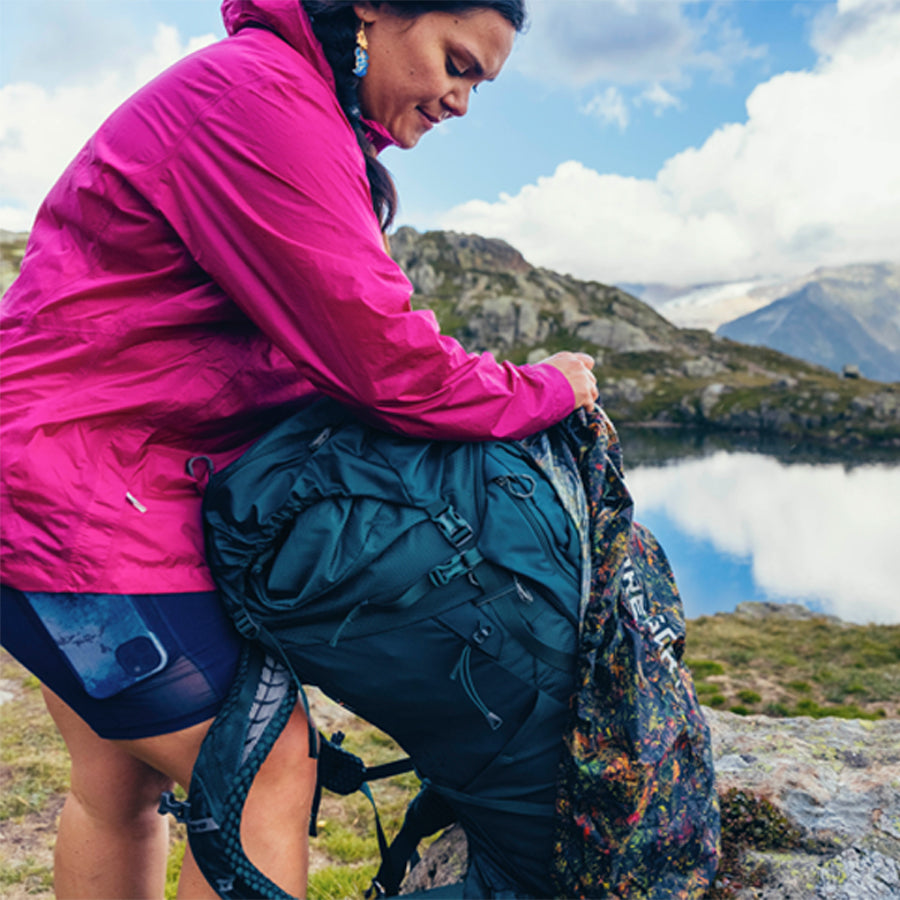 よりサステナビリティーなアプローチの防水プロテクションです。私たちのレインカバーコレクションはリサイクルポリエステルリップストップ素材を使用し、あなたのパックを悪天候から守ります。リフレクターロゴ、確実な装着方法、整然としたパッケージは雨の日でもあなたをトレイルへ誘います。