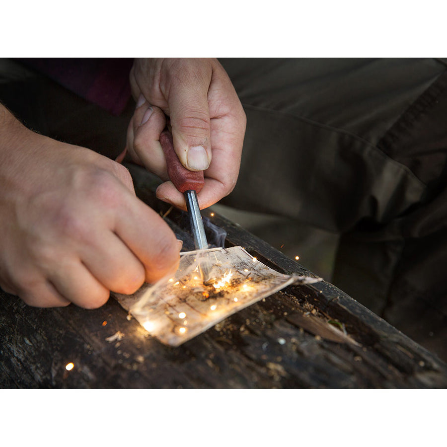 約3,000度の火花を飛ばすことができるフェロセリウム製ロッドのファイヤースターターです。ロッド径が太いため長く使うことができます。オリジナル樹脂ハンドルにトナカイ革のストラップがつき、手になじみやすいデザインです。