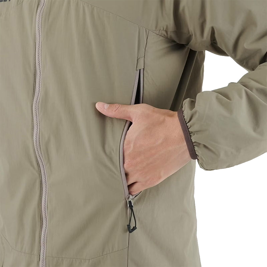 きわめて高い撥水性を備えた、スタンドカラーの軽量ウィンドシェルジャケット。繊維自体に水を弾く加工を施し、空気の流れを妨げずに優れた防風撥水性を実現したブリーズバリヤー®素材を採用。風や雨を防ぎながらも蒸れにくく、軽くてしなやかな着心地とあいまって快適な行動をサポートします。裏地には起毛メッシュを使用し、心地よい肌触りを提供。左ポケットに収納可能なパッカブル仕様で、コンパクトに収納が可能です。行動中の肌寒さを防ぐアウターとして、あるいは冬のアクティブなスポーツなどの中間着としてなど、一年を通じてさまざまな着回しができる便利な一着です。