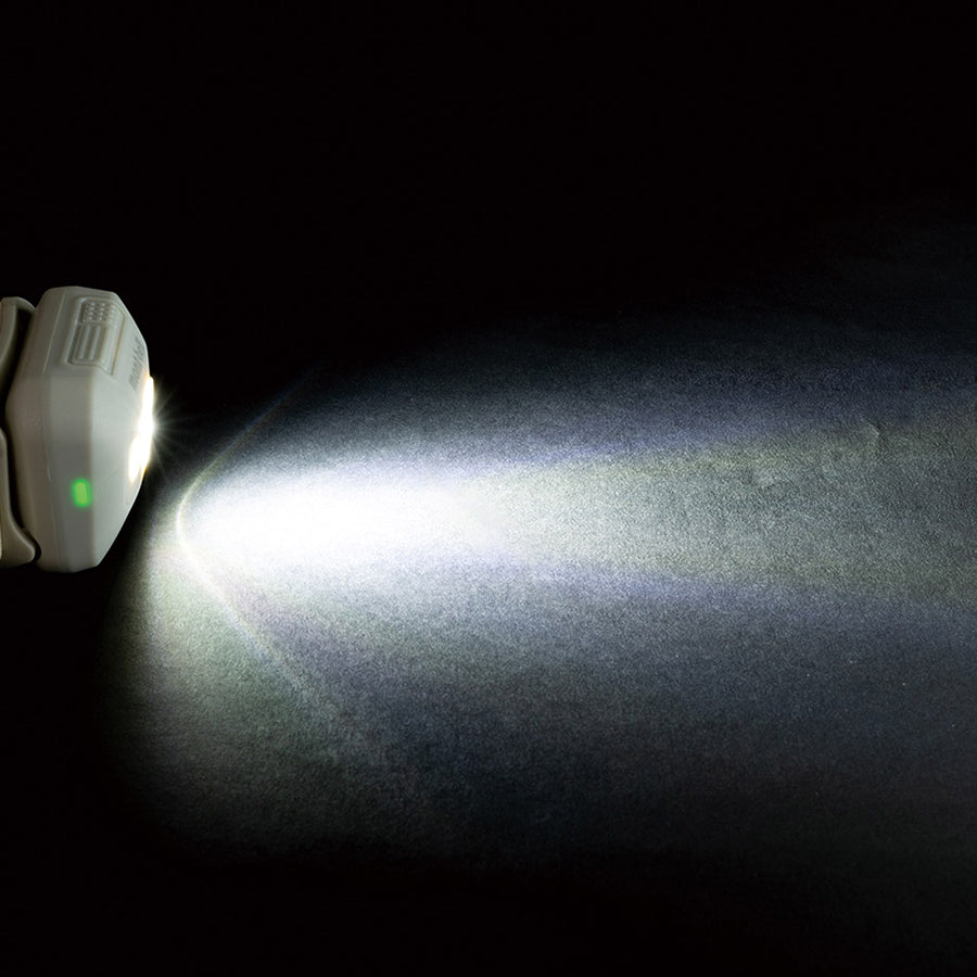 ヘッドランプはダブルクリック点灯式を採用。スイッチを1秒間に2回押すことで点灯します。バックパックやかばんの中で不意にスイッチがオンにならず、電池の消耗を防ぎます。