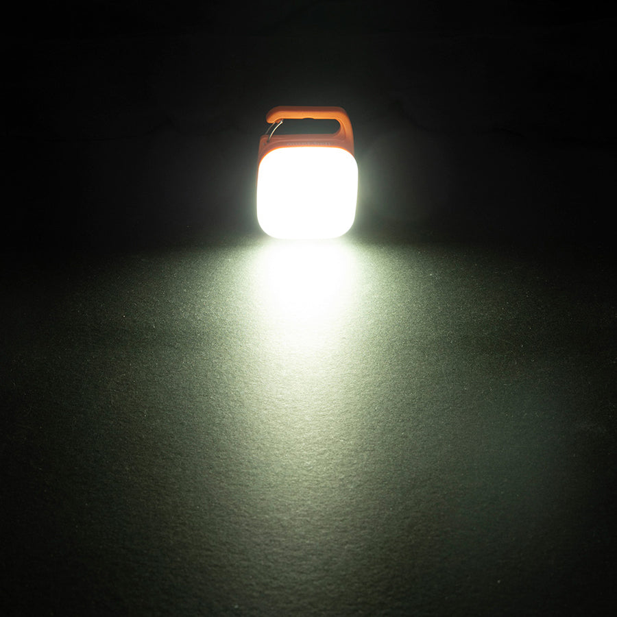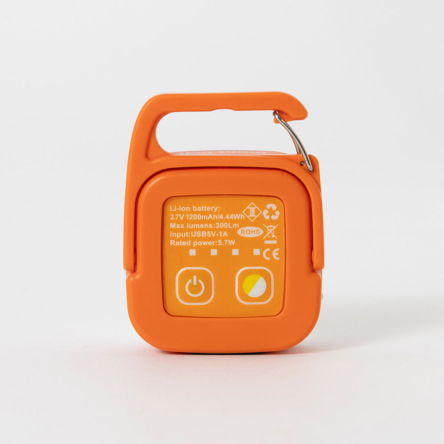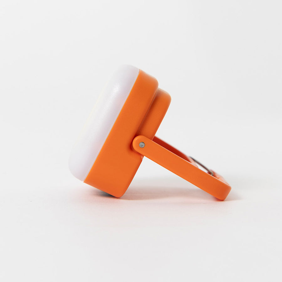 広範囲を照らすことができる面発光のミニランプです。ワイヤーゲートのフックがついています。キャンプでのテント内吊り下げライトとして、通勤通学の帰りの夜道や犬の散歩のセイフティライトとしてなど、さまざまなシーンで使用できます。明るさは3段階、ライトの色は白色、電球色、赤色の点滅の3種類を切り替えられます。充電ポートはUSB Type-Cです。
