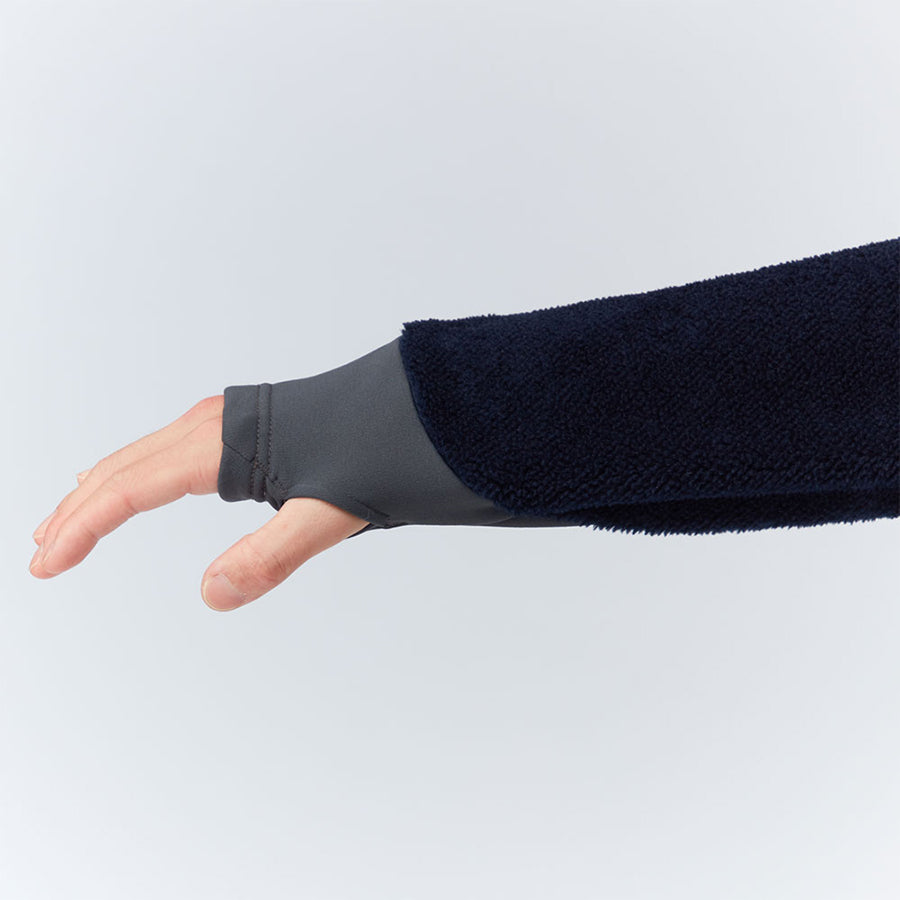 毛足の長いポリエステル繊維を編み込んだフリース素材です。多くの空気を蓄えることができるため、高い保温性を備えています。 -