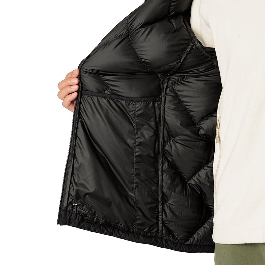 【特長】独自のキルティングパターン / ダウンプルーフ加工 / デュアルアクスルフード / シングルキルト構造 / ジッパーがあごに当たらない仕様 / リードインコード・システム / スタッフバッグ付き