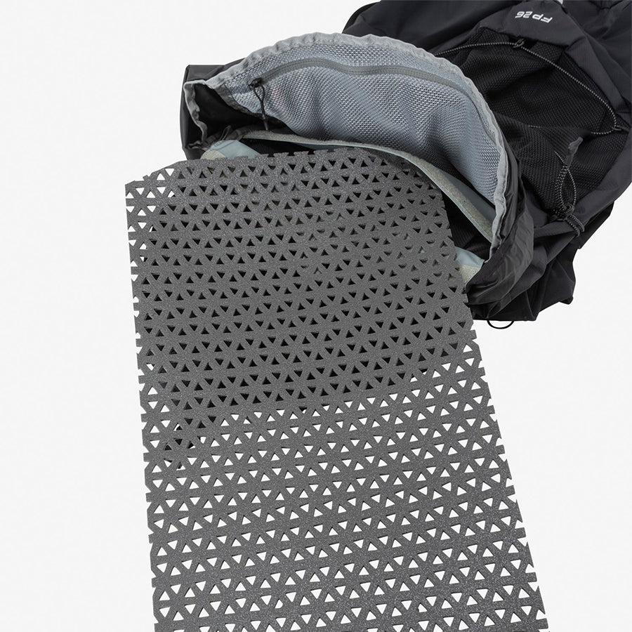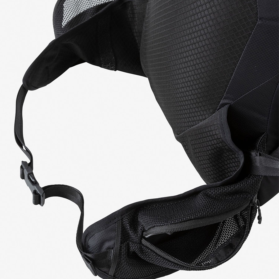 背負ったままでも収納にアクセスできるよう、内部へ直接アクセスできるサイドファスナー、簡易雨蓋のストレッチポケット、ショルダーハーネスのストレッチボトルポケット、ヒップベルトの大型ファスナー付きポケット、サイドのストレッチポケットを備え、スピードを緩めずに行動し続けられます。大型のフロントメッシュポケットと本体サイドには、コンプレッションバンジーコードを装備。荷物の収納量に応じて調整することで、荷物のブレを抑制可能。スピードハイクなど、行動の速い登山シーンに活躍します。