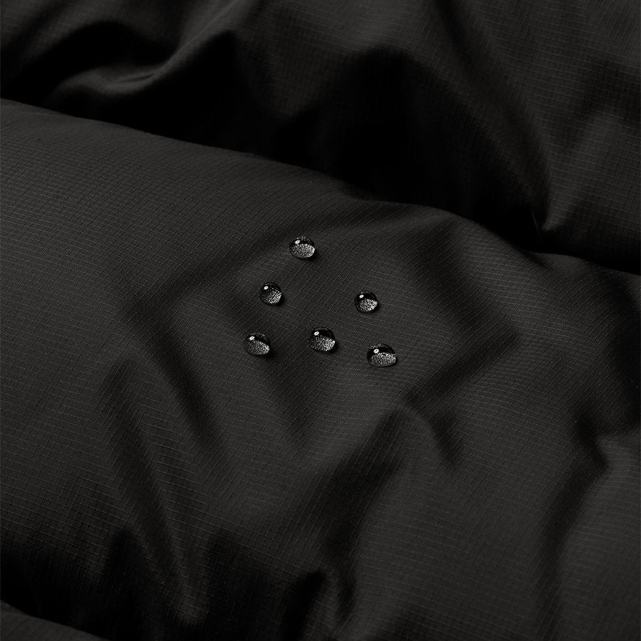 環境に配慮したリサイクルダウンを中わたの一部に使用。表地は強度がある40デニールのリップストップナイロンにはっ水加工を施し、パックに干渉する肩部分は厚手のナイロン素材に切り替えています。