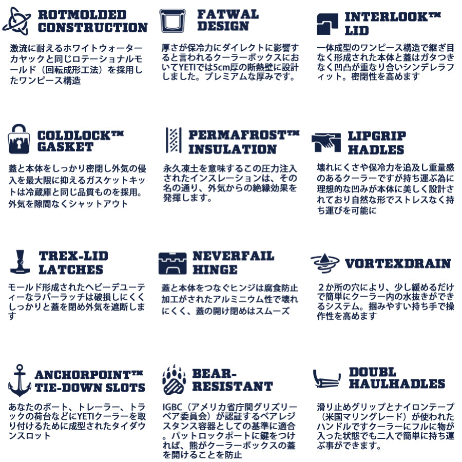 大人数のキャンプで食料を持ち運ぶには最適なサイズです。一般的なクーラーボックスとは違い、激流に耐えるホワイトウォーターカヤックと同じロテーショナルモールド(回転成形工法)を採用したワンピース構造です。蓋、ボディ共に継ぎ目無くモールドされ、耐衝撃性と、長期使用においての耐久性に優れています。一般的なクーラーボックスはインシュレーションとボディの外壁が接着剤で接合されているモデルが多く、時間が経つにつれ接着剤の劣化による剥離やつなぎのパーツが破損してしまう事があります。YETIクーラーは圧力注入された分厚い5cmのインシュレーションと密閉性の高いシステムにより保冷力を高め、他社製品を寄せ付けない高い性能を発揮します。